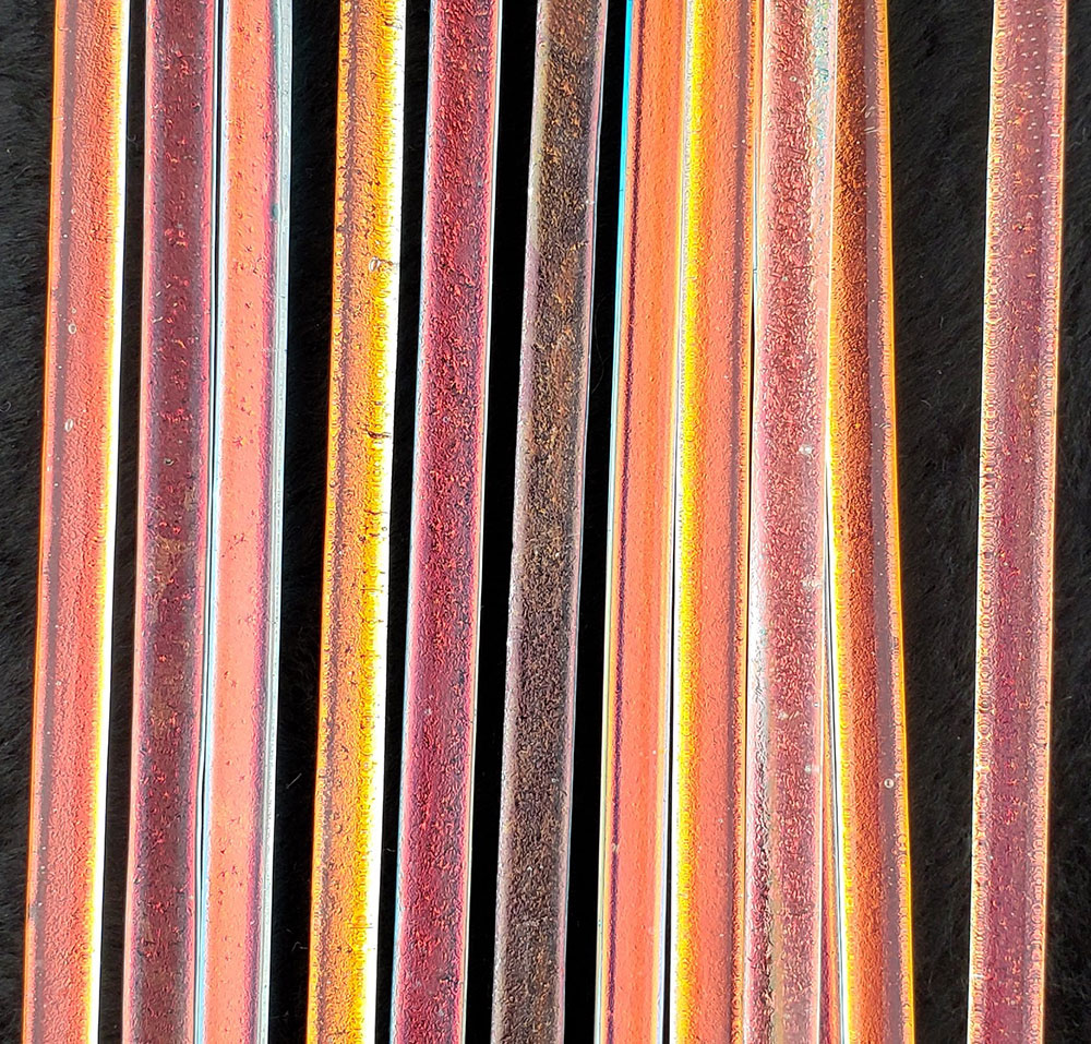 Riley Designs 104 COE Dichroic Strips. Sold by the ounce, you get approximately 2, 12″x 1/4 strips in a 1 oz package.