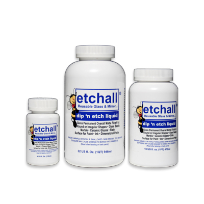 etchall® dip ‘n etch is a re-usable etching liquid with the consistency of water. Use by “dipping” (submerging) glass objects to create an overall etched surface. Can be used with etchall® resist gel to create beautiful designs.