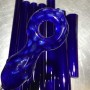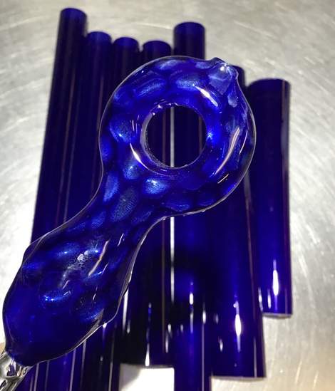 A deep blue color with satin shimmer inside a deep cobalt layer. Handpulled Blue Satin Dipped in Cobalt overlay tube. Preheat slowly in kiln to avoid cracking.