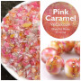 Val Cox Frit Pink Caramel – Warm undertones of reactive ochre offset striking pink to create layered orange tones. 96coe. Sold as a 3oz refill package. Silver glass colours are 2.5 oz