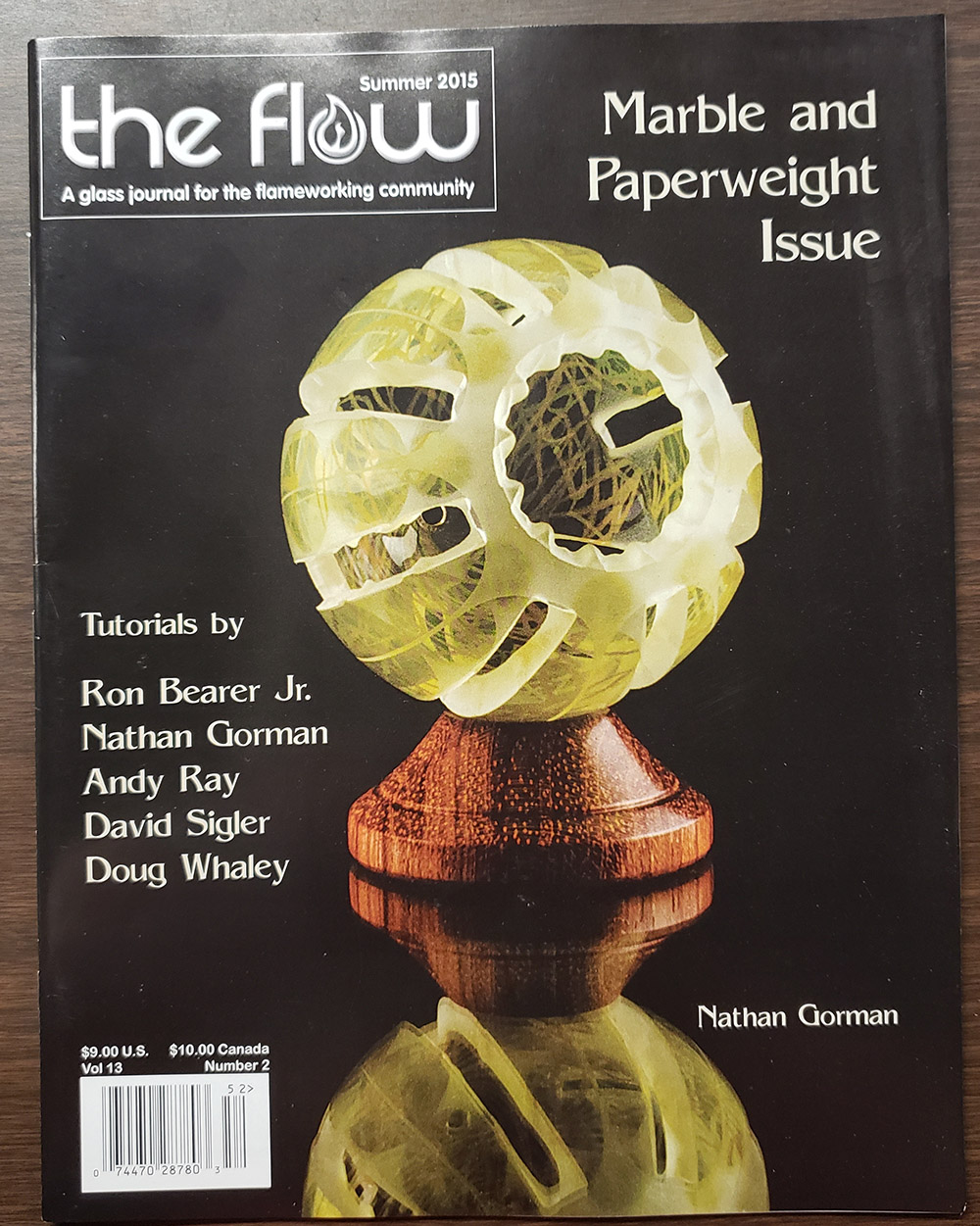 You’ll be amazed by the celebration of the wonder of spherical glass art in The Summer 2015 issue of The Flow, which features the creations of over 50 marble and paperweight artists. Included are tutorials for using glow powder, creating a vortex marble, and sand carving designs into frit-layered marbles plus a look at the life and work of Ro Purser, father of the American Contemporary Marble movement. Tips from Bandhu Dunham on constructing marble runs, a special tribute to renowned marble collector, Bert Cohen, and news on the latest products to make your adventures in glass easier and more enjoyable round out this fabulous issue.